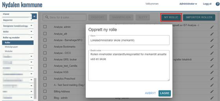 Gå til Roller og moduler > Roller > klikk på Ny rolle. Velg navn og beskrivelse av den nye rollen