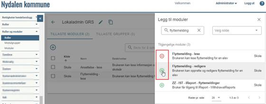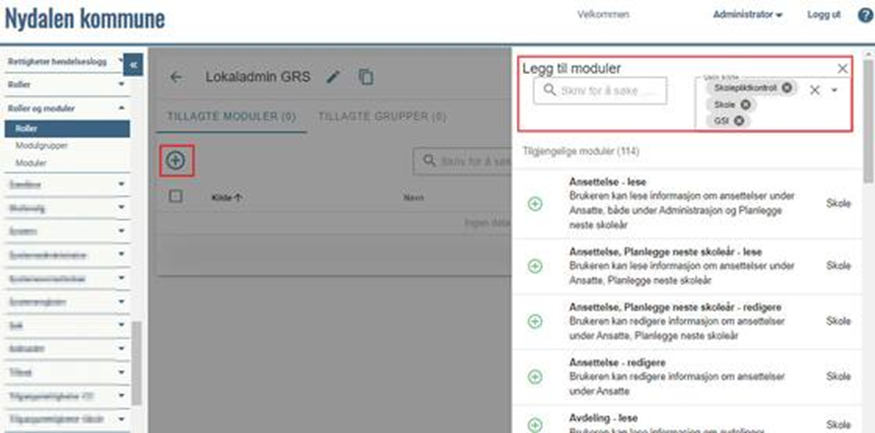 Velg modulene som skal tilhøre denne rollen ved å klikke på +-ikonet bak modulen De som er valgt vises med et rødt minustegn (klikk på dette hvis du ikke ønsker den modulen allikevel):