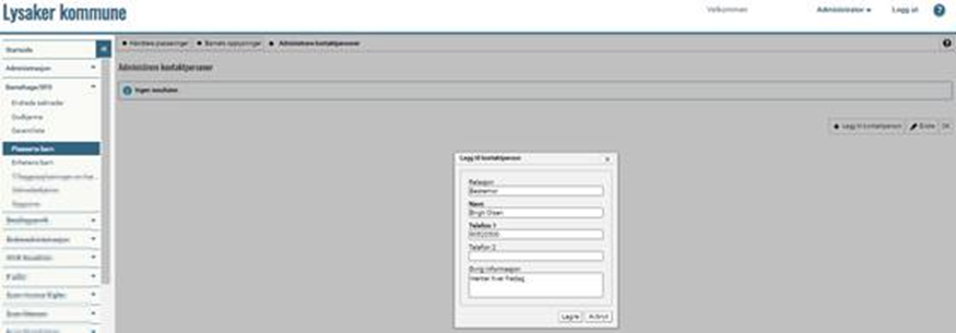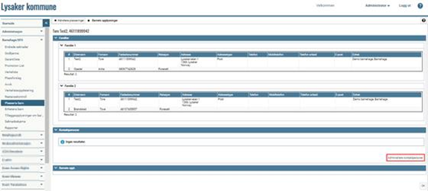 I vinduet som åpnes er en oversikt over informasjon om familierelasjoner og kontaktpersoner. Hvis du vil endre eller legge til en kontaktperson, trykk på Administrere kontaktpersoner: