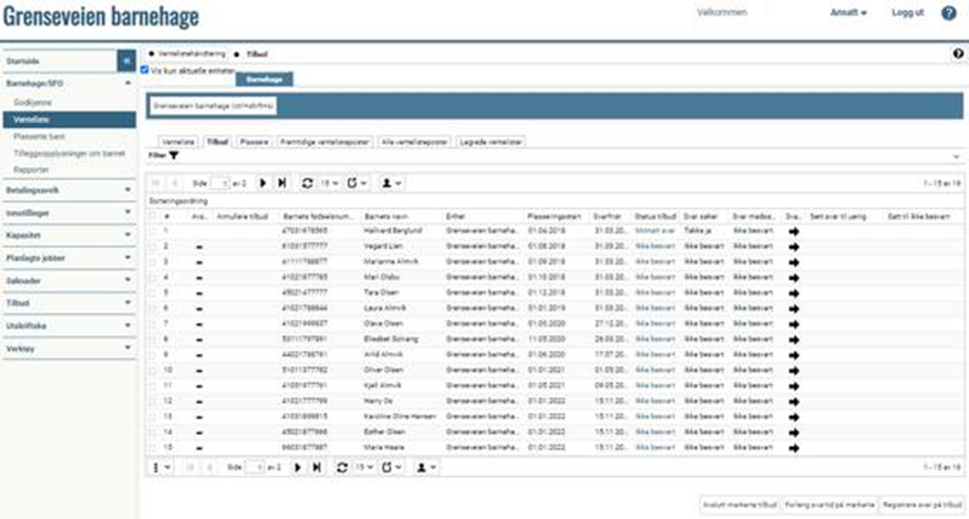 Gå til "Barnehage/SFO" > "Venteliste" Klikk på fanen Tilbud for å se opprettede tilbudsposter: