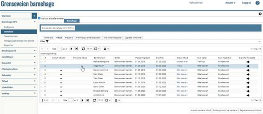 Gå til "Barnehage/SFO" > "Venteliste" Klikk på minus i kolonnen Annullere tilbud: