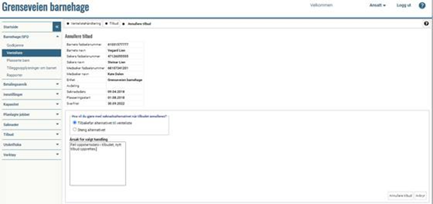 NB! Ikke velg Steng alternativ dersom søknadsalternativet skal tilbake til ventelisten. Klikk på Annullere tilbud