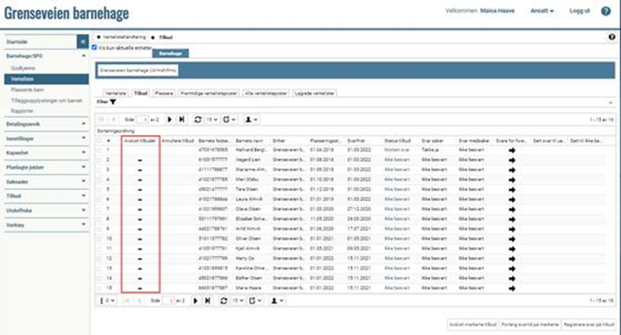 Gå til "Barnehage/SFO" > "Venteliste" Klikk på fanen Tilbud Trykk på minus-ikonet i kolonnen Avslutt tilbudet.