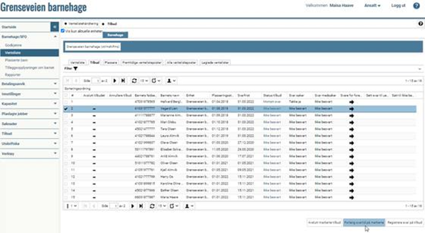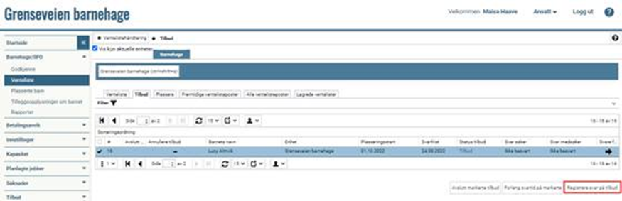 Gå til "Barnehage/SFO" > "Venteliste" Klikk på fanen Tilbud Marker barnet Klikk på Registrer svar på tilbud:
