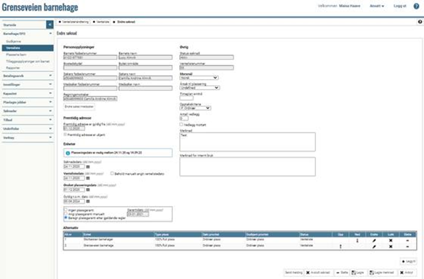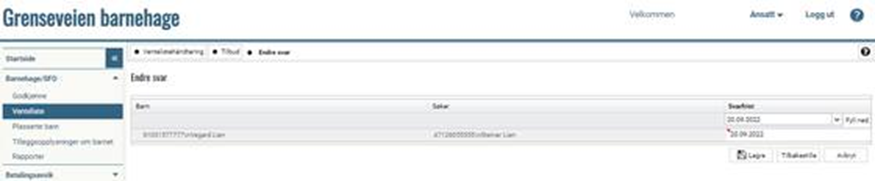 Gå til "Barnehage/SFO" > "Venteliste" Sett ønsket filter for å hente fram søknaden. Klikk på endreblyanten, du får opp dette bildet: