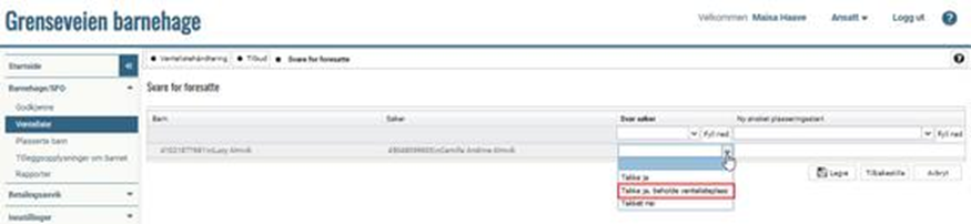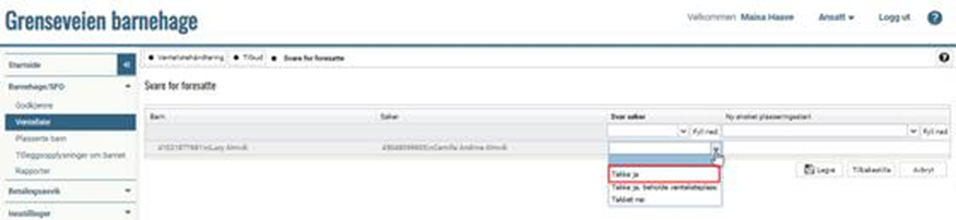 NB! Gå til fanen Plassere etter du har lagret. Barnet blir nå gjenværende til sine høyere prioriterte søknadsalternativer iht. innstillinger. Dersom det er slik i din kommune at foresatte skal svare på tilbud via publikumsportalen, så finner du de som har takket Ja under fanen Plassere.