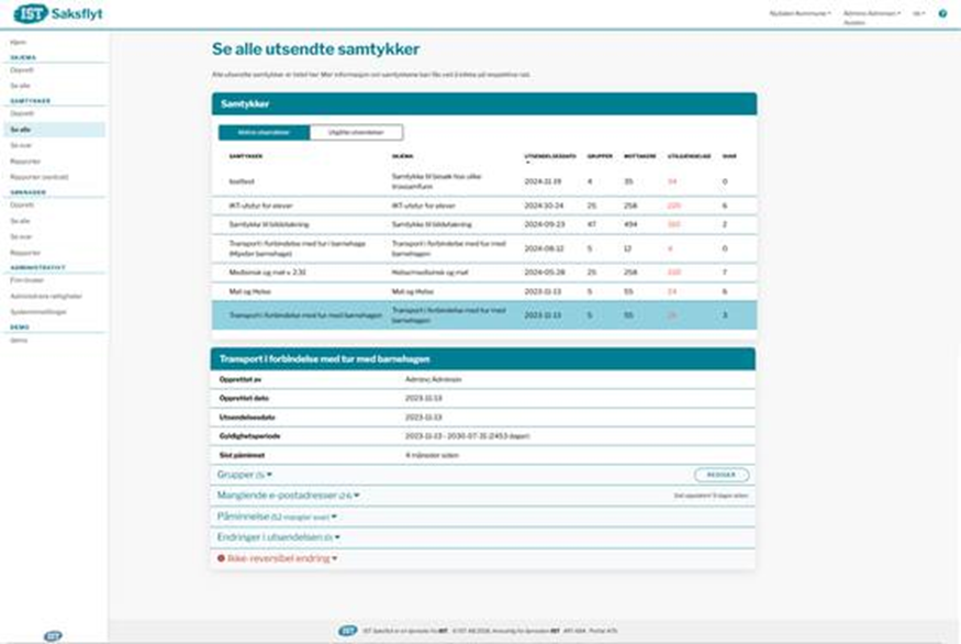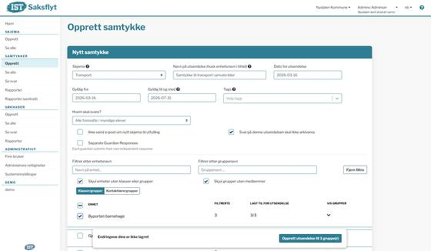 Samtykker over flere år anbefales kun dersom man har et samtykke som skal besvare av alle foresatte ved alle enheter i kommunen. Da vil gruppene oppdateres automatisk. Dersom samtykket eksempelvis kun skal gjelde 1. trinn og være gyldig 7 år frem i tid, må gruppene her oppdateres manuelt etter opprykk til nytt skoleår. Gå inn på Samtykker > Se alle > klikk på utsendelsen og Rediger. Marker alle gruppene/klassene og Lagre.