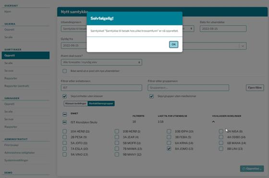 Hvis du ber om samtykker for enkelte grupper eller klasser, bør disse kun være gyldig for inneværende skoleår, og du må lage nye for neste skoleår. Dette fordi samtykker som opprettes for enkeltgrupper eller klasser vil knyttes til den spesifikke gruppen, og en elev vil ikke lenger være medlem av denne gruppen neste år.