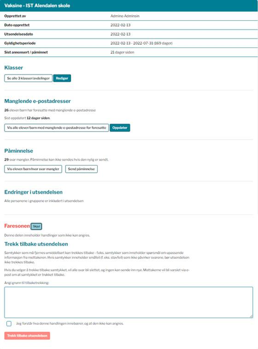 - Samtykker som må fjernes umiddelbart pga. upassende innhold kan trekkes tilbake. Hvis det dreier seg om små skrivefeil som ikke påvirker svarene, bør utsendelsen ikke trekkes tilbake. Hvis du velger å trekke tilbake samtykket, vil alle svar bli slettet, og ingen kan sende inn nye. Mottakerne vil bli varslet via e-post om at samtykket er trukket tilbake. Du må oppgi en grunn til tilbaketrekking.