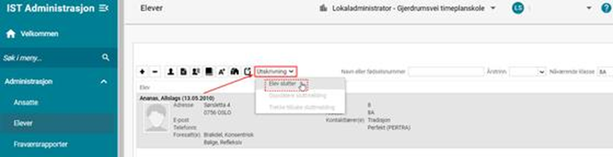 Gå til Administrasjon > Elever > marker eleven > klikk på Utskrivning > Elev slutter: