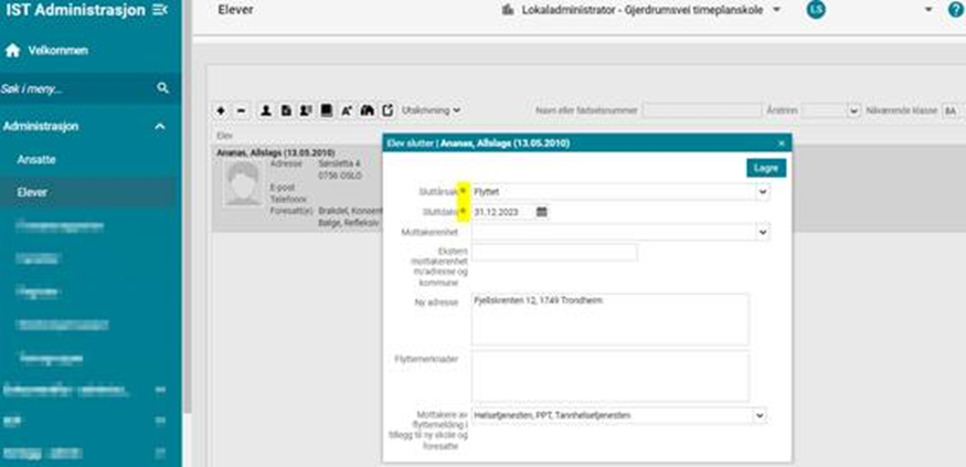 Feltene Sluttårsak og Sluttdato kan endres etter sluttdatoen er passert. Du kan enten gå til Elevinformasjon - fane Flytting eller du kan fra elevregisteret endre filter så du får søkt fram eleven og trykk på Utskriving - Oppdater sluttmelding for å endre informasjonen før du trykker på Lagre og skriver ut ny sluttmelding.