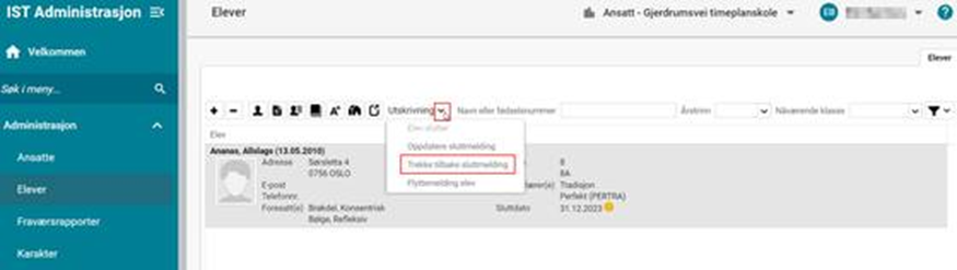 Hvis eleven ikke skal slutte allikevel, marker eleven > Utskriving > Trekke tilbake sluttmelding: