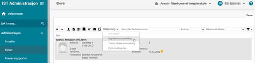 Gå til Administrasjon > Elever > bruk filter for søke fram eleven Klikk Utskriving > Oppdatere sluttmelding