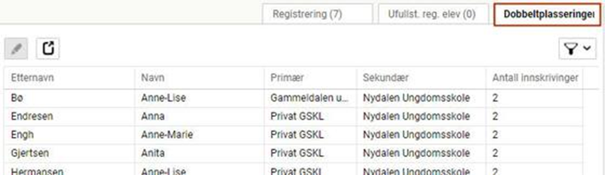 Fanen Dobbeltplasseringer vises under Planlegge neste skoleår - Foreslåtte nye elever. Denne fanen har egentlig ikke med planlegging av neste skoleår å gjøre, men fanen gir en visning av elever som har flere innskrivinger. Det vil si skoletilknytninger hvorav minst en av dem er på din enhet.