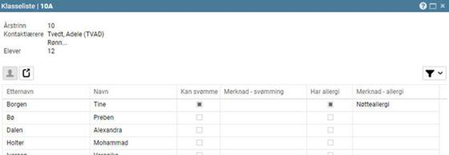 Feltene som gjelder svømmedyktighet og allergi kan hentes fram i listeform og filtreres på. Gå til Administrasjon > Skoleorganisasjon > Klasser > marker en klasse > velg Klasseliste. Feltene hentes fram som kolonnevalg og visningen kan eksporteres til Excel om ønskelig.