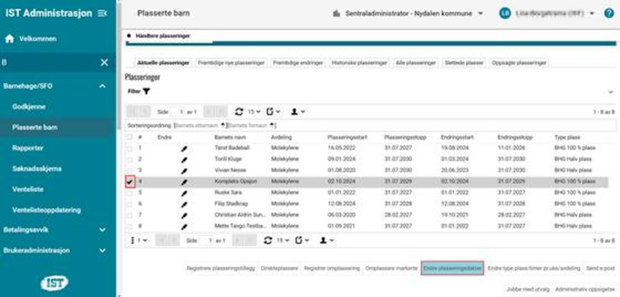 Gå til Barnehage/SFO > Plasserte barn Klikk på fanen Framtidige nye plasseringer Marker plasseringen og trykk på Endre plasseringsdatoer: