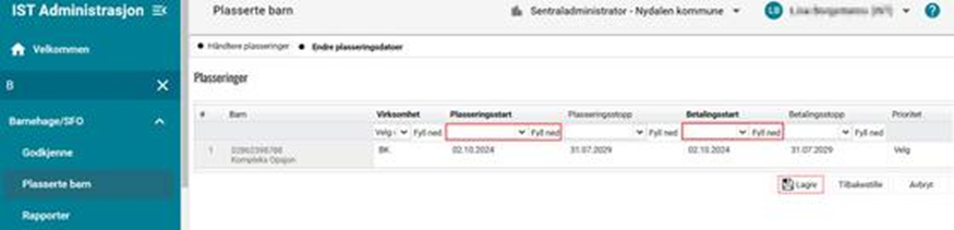 Både Plasseringsstart og Betalingsstart må endres . Velg dato og trykk på Fyll ned før du trykker på Lagre: