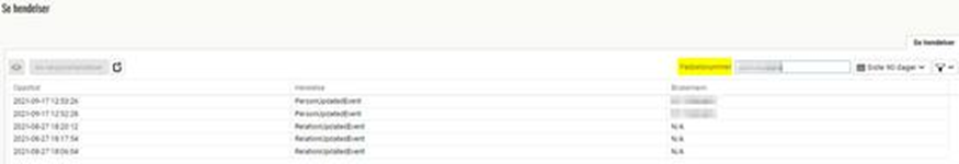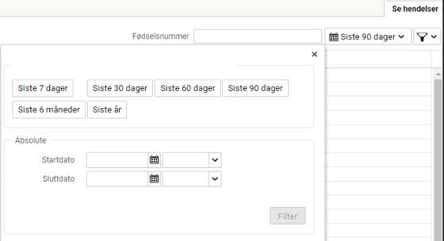 Du kan søke på ett fødselsnummer ved å skrive det inn i hurtigfilter-feltet for å enkelt søke fram alle loggede endringer registrert i tilknytning til personen innenfor angitt tidsperiode: