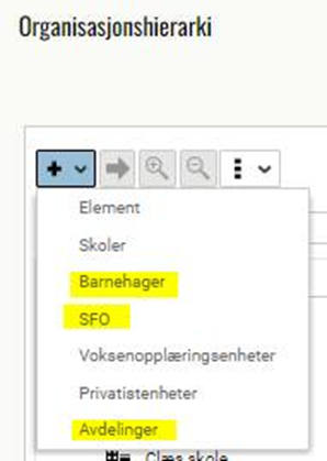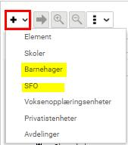 Gå til Organisjon > Organisasjon Trykk på Legg til (pluss) og velg barnehage, avdeling eller SFO: