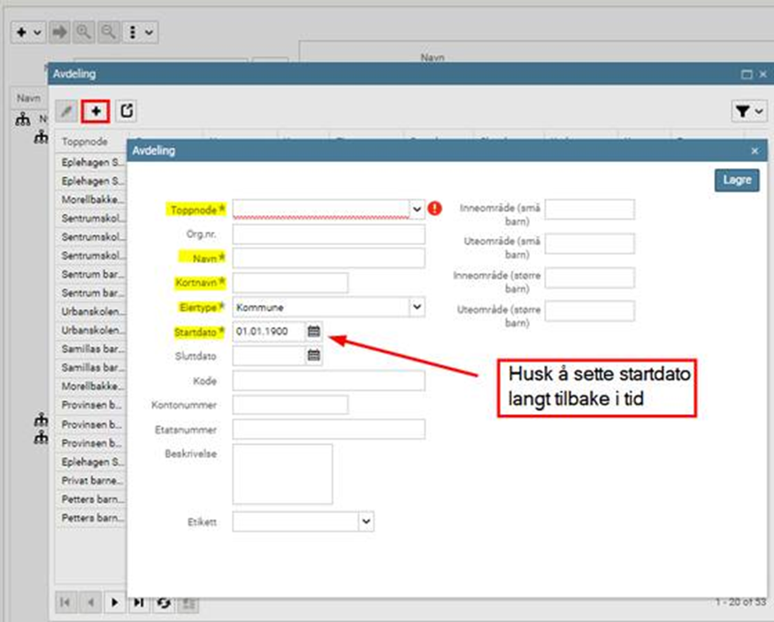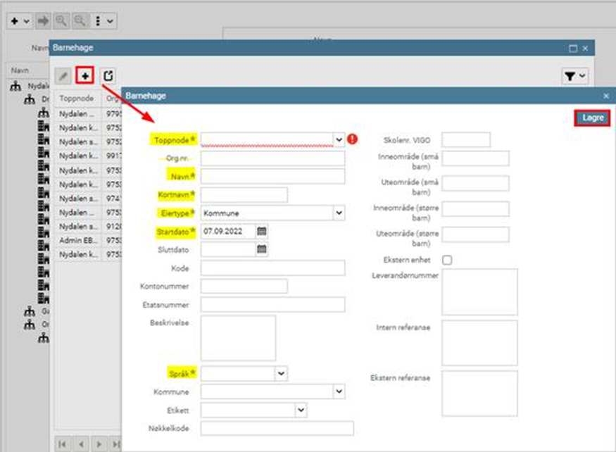 Trykk på Legg til og velg Toppnode (den barnehagen/SFO-enheten som avdelingen skal knyttes til)