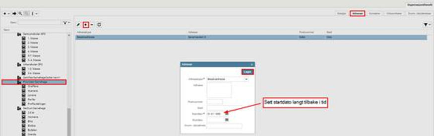 Velg Toppnode og fyll inn organisasjonsnummer (ikke obligatorisk), navn, kortnavn (må være unikt), eiertype, startdato (settes lang tilbake, se eksempel), kode (gjerne samme som i kortnavn), samt språk Klikk på Lagre Gå tilbake til organisasjonshierarkiet og registrer adresse på enheten ved å markere enheten > gå til fane Adresser > trykk på Legg til: