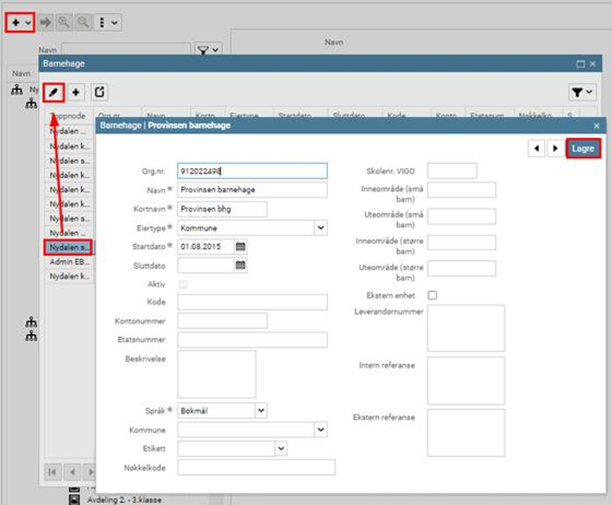 Gå til Organisasjon > Organisasjon Trykk Legg til og velg barnehage (eller SFO):