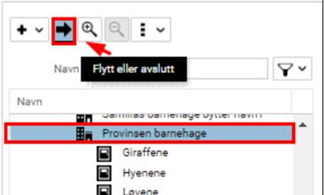 Gå til Organisasjon > Organisasjon Marker enheten eller avdelingen som skal stenges/avsluttes. Trykk på Flytt eller avslutt:
