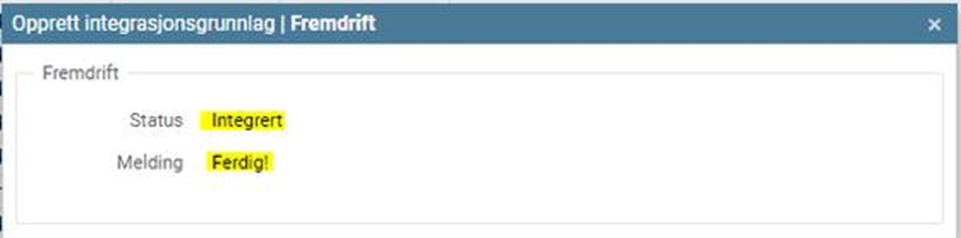 Det kommer melding når integrasjonsgrunnlaget er opprettet: