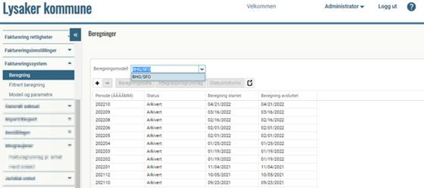 Gå til Faktureringssystem > Beregning og velg beregningsmodell BHG/SFO i nedtrekksmenyen: