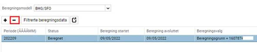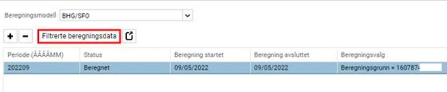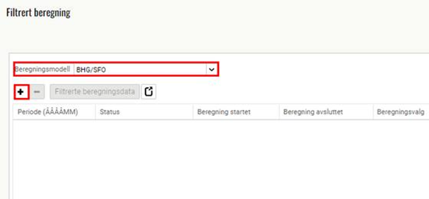 Velg beregningsmodell BHG/SFO Ny filtrert beregning legges til ved å trykke på Legg til (pluss) Skriv inn perioden (ÅÅÅÅMM) og fødselsnummeret til beregningsgrunn