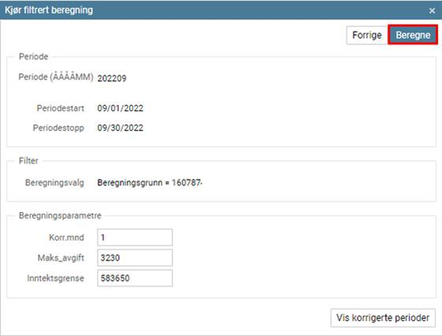 Eventuelle feil må rettes opp og filtrert beregning må foretas på nytt. Den allerede utførte filtrerte beregningen må først slettes ved å markere og deretter klikke på ![]()