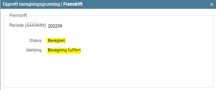 Beregningen er fullført når du får meldingen Ferdig! (du ser feltene Status og Melding utfylt med Beregnet og Beregning fullført):