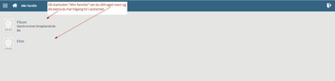 Når du har logget inn kommer du til startsiden "Min familie" som viser ditt navn og de elever du har tilgang til: