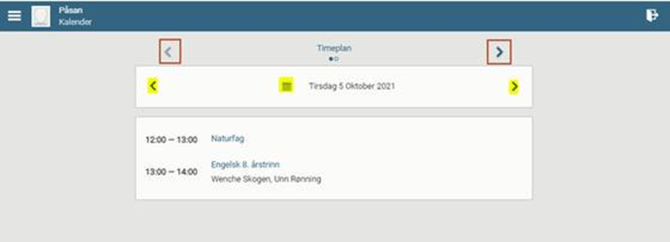 Det første bildet som vises er elevens timeplan i dag. Du kan endre dag med pilknappene til høyre og venstre for datoen eller velge en dato ved å klikke på kalenderikonet (markert med gult) :
