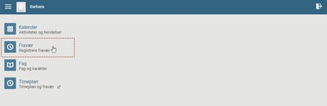 Klikk på ett barn / en elev du har tilgang til, og klikk på menypunktet "Fravær/Registrere fravær":