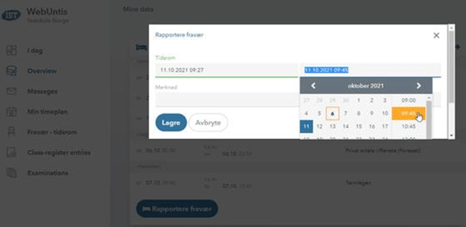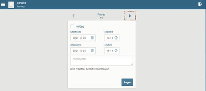 - For å registrere timefravær velg riktig dag i feltene "Startdato" og "Sluttdato". Velg klokkeslett ved å bruke scrollefunksjonen eller ved å skrive rett i feltene "Starttid" og "Sluttid". Skriv inn en kommentar hva fraværet gjelder. Ikke skriv inn senitiv informasjon. Lagre.