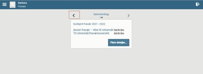- Hvis du ønsker å se et sammendrag av elevens fravær i dager og timer går du til neste side med pilknapp mot høyre