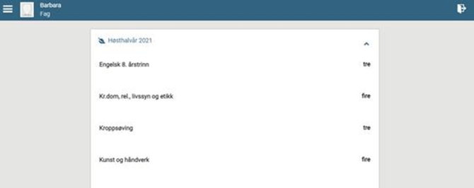 Gå til menypunktet "Fag og karakterer" for å se en liste over publiserte karakterer i fag og orden/oppførsel for inneværende skoleår. Der hvor det finnes merknad til karakteren vises denne under fagnavnet. Karakteren vises helt til høyre: