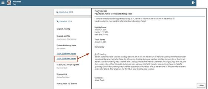 Hvis lærer har sendt varsel om at eleven står i fare for å ikke å få karakter i et fag, orden eller oppførsel, vises varselet under det aktuelle faget (event. orden/oppførsel). Klikk på linjen for å se varselbrevet: