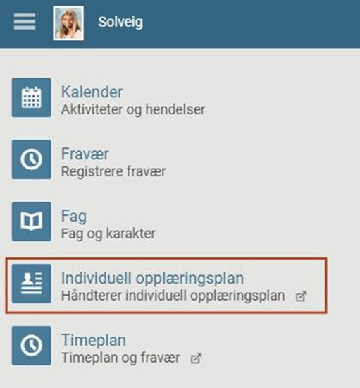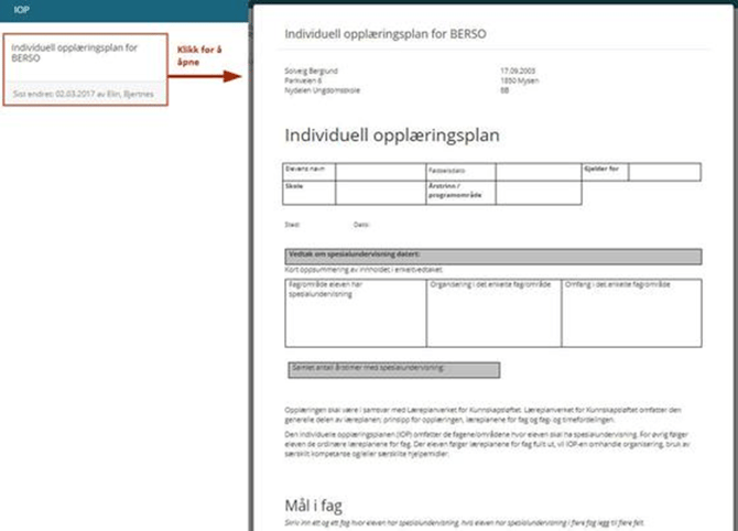 Hvis det er fattet et vedtak på barnet (f.eks. en IOP), og skolen har valgt å benytte modulen, vil du se et menypunkt som heter Individuell opplæringsplan: