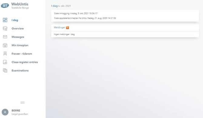 Timeplan åpnes i en ny fane i nettleseren, og du kommer til vinduet "I dag" som blant annet viser når du sist var innlogget: