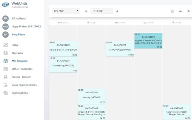I menypunktet Min timeplan ser du elevens timeplan (om du har tilgang til flere elever kan du velge hvem som skal vises i plukklisten).