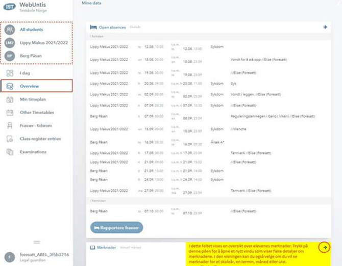 Det åpnes et nytt vindu. I menyen helt til venstre på skjermen trykker du på menyen Overview (Mine data). Da vises fravær og merknader som er registrert for alle de elevene du har tilgang til. Øverste del av skjermbildet vises fravær og nederste del vises merknader.