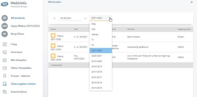 Hvis du klikker på pilen ved merknader får du opp et nytt vindu som viser mer informasjon om merknadene, og du filtrere visning av merknader etter skoleår, termin osv.: