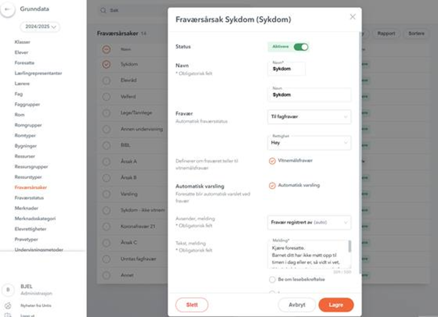 - Gå til Timeplan > Grunndata > Fraværårsaker