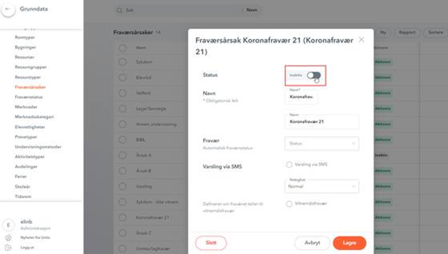 Hvis du ser en fraværsårsak som ikke lenger skal benyttes, er det viktig at du IKKE sletter fraværsårsaken, men setter den til Inaktiv.