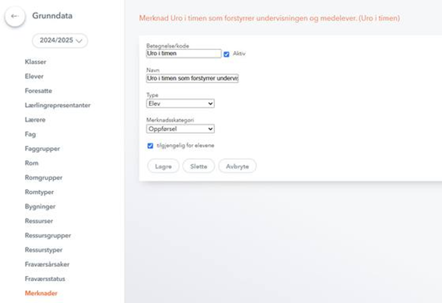 Hvis dere skal slutte å bruke en merknad, husk å sette den som inaktiv i stedet for å slette den. Tidligere registrerte merknader av denne type vil fortsatt være synlige for brukerne. Merk! Det kreves at det har gått en synkronisering for at oppdaterte merknader skal være synlig for lærer som fører merknader fra Startsiden i lærerapplikasjonen. For lærere som fører merknader fra IST Timeplan (WebUntis) vil nedtrekksmenyen være oppdatert umiddelbart uten at det er behov for synkronisering.