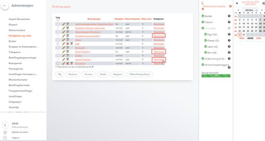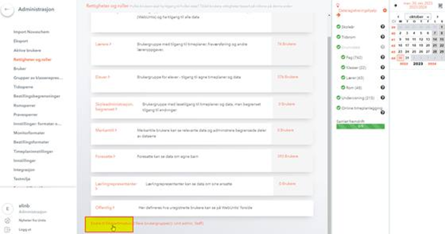 Gå inn på henholdsvis Lærere, Foresatte og Elev ved å trykke på ordet Rettigheter helt til høyre på aktuell rolle: