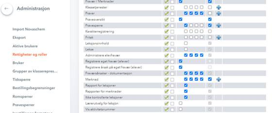 I vinduet som åpnes vises en lang rekke med rettigheter. Kryss av for ønskede felt (bildet viser et eksempel fra lærer):