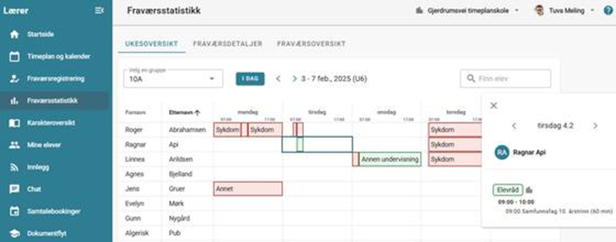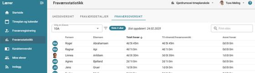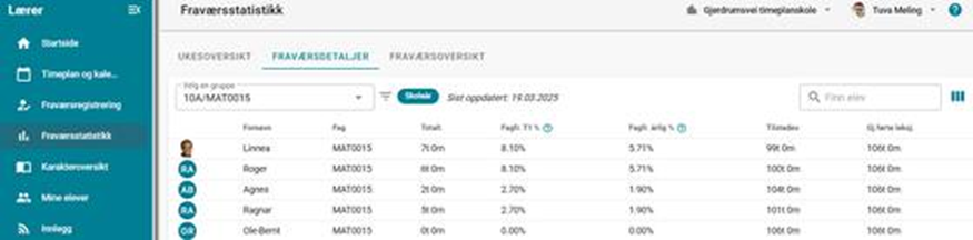 - Kontaktlærer kan gå til menypunkt Fraværsstatistikk > fane Fraværsoversikt. Fanen viser en forenklet fraværsoversikt